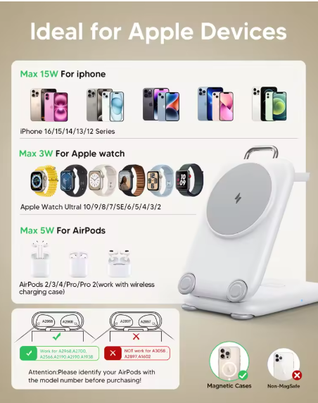 ✅ 3-in-1 MagSafe Charger – Simultaneously charge your iPhone, Apple Watch & AirPods.